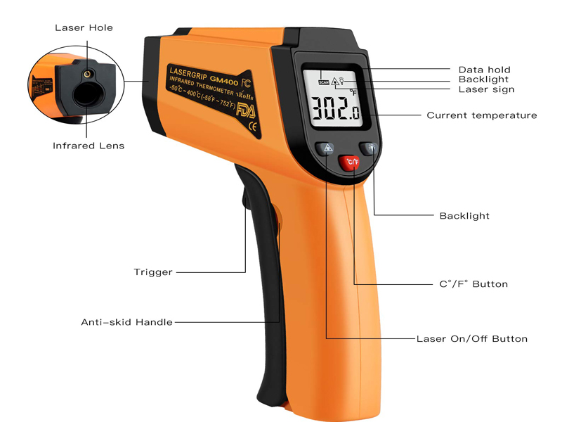 Thermometer collects the infrared radiation energy from surface of the stuff that is focused by red laser, and transfer this information into electric signal via photodetector, then analyze and calculate its temperature. So please keep in mind that what you get is the surface temperature not inside temperature.