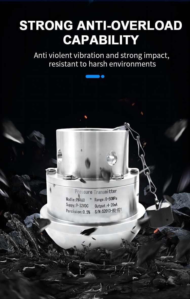 PM460 Hammer union pressure transmitter is made of high-strength, high-elasticity, corrosion-resistant stainless steel. It is a high-reliability, corrosion-resistant, high-long-term stability product specially designed for oil pressure testing of oil wells such as cobalt wells, cementing and fracturing vehicles.